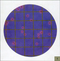 Estimated s.aureus count = 150Petrifilm 圖形的生長面積大約30平方公分.可以 估算方式,先數(shù)三個方格內(nèi)粉紅色環(huán)帶的數(shù)量,在乘以10,即為所有在圖形培養(yǎng)范圍內(nèi)的菌落數(shù). |