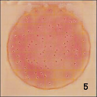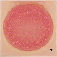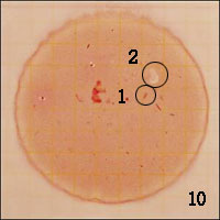 Coliform count = 30圓圈1, 2和3中的氣泡形狀有所不同。圓圈1中的氣泡和菌落相鄰;圓圈2中的氣泡撐破了菌落,使菌落看似氣泡的“輪廓”;圓圈3中的菌落被3個小氣泡圍住。細菌學手冊上規(guī)定,紅色不帶有氣泡的菌落不計作大腸菌群。 |